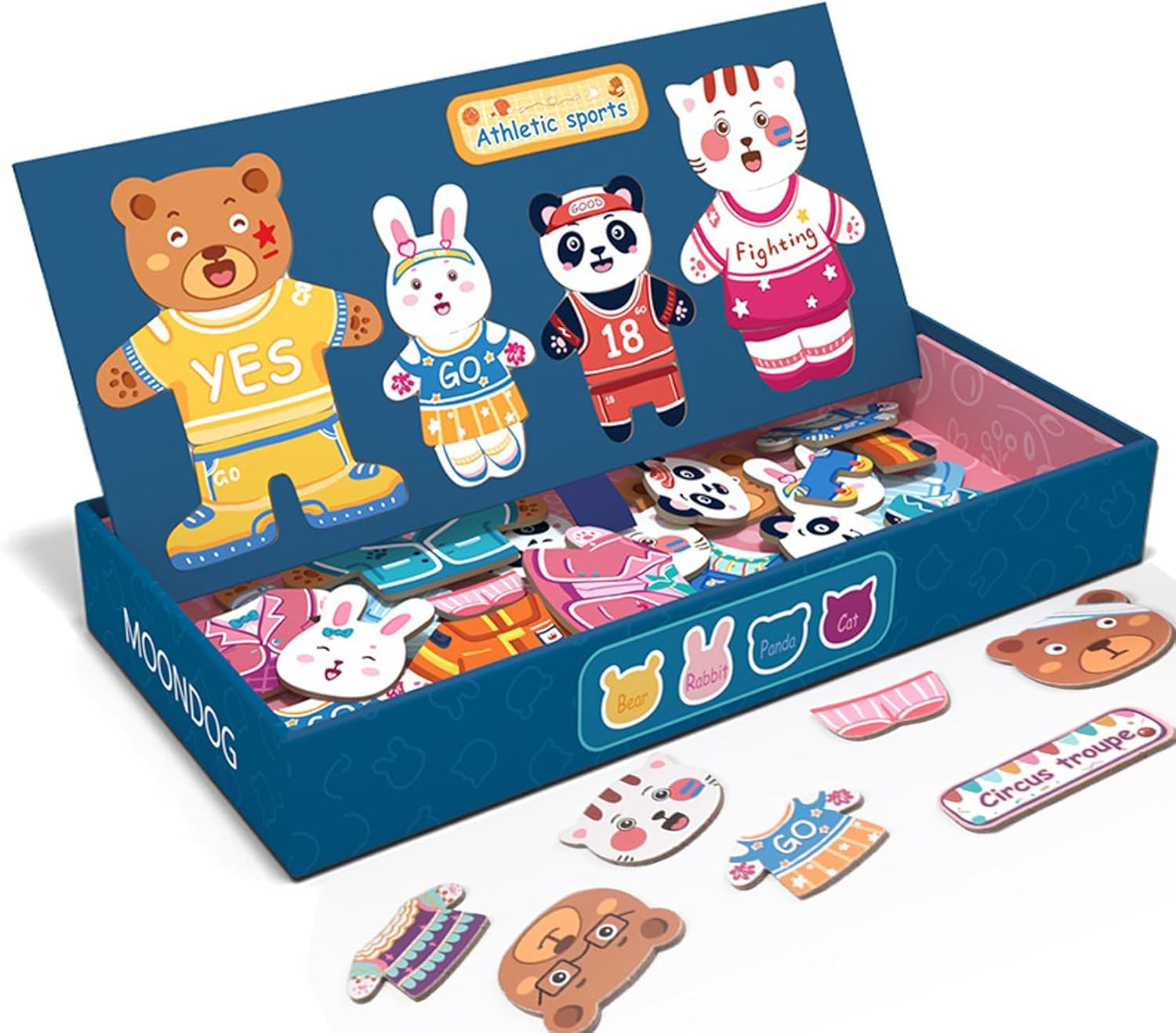Deja volar tu imaginación con este juego de juguetes de vestir magnéticos. Incluye 4 papeles magnéticos de animales y 5 conjuntos de una gran variedad de bonitos vestidos y accesorios magnéticos como vestidos, sombreros, gorros, bolsos y zapatos