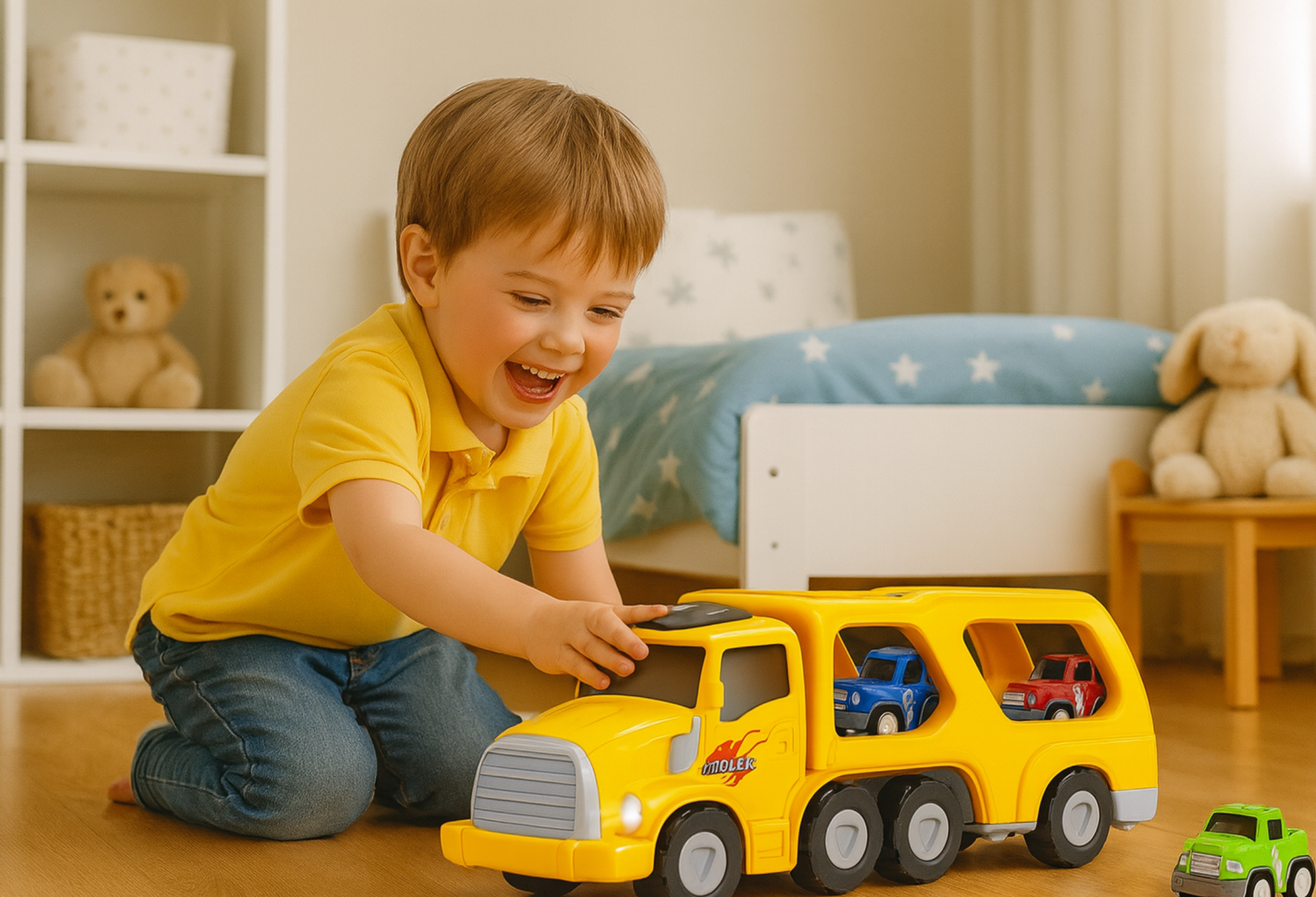 Camiones de juguete de transporte coloridos 5 en 1 que incluyen grande transportador, mini avion, jeep, taxis y camioneta. Los coloridos autos de juguete con expresiones lindas e imágenes de dibujos animados, pueden atraer la atención de los niños y mejorar la capacidad práctica.