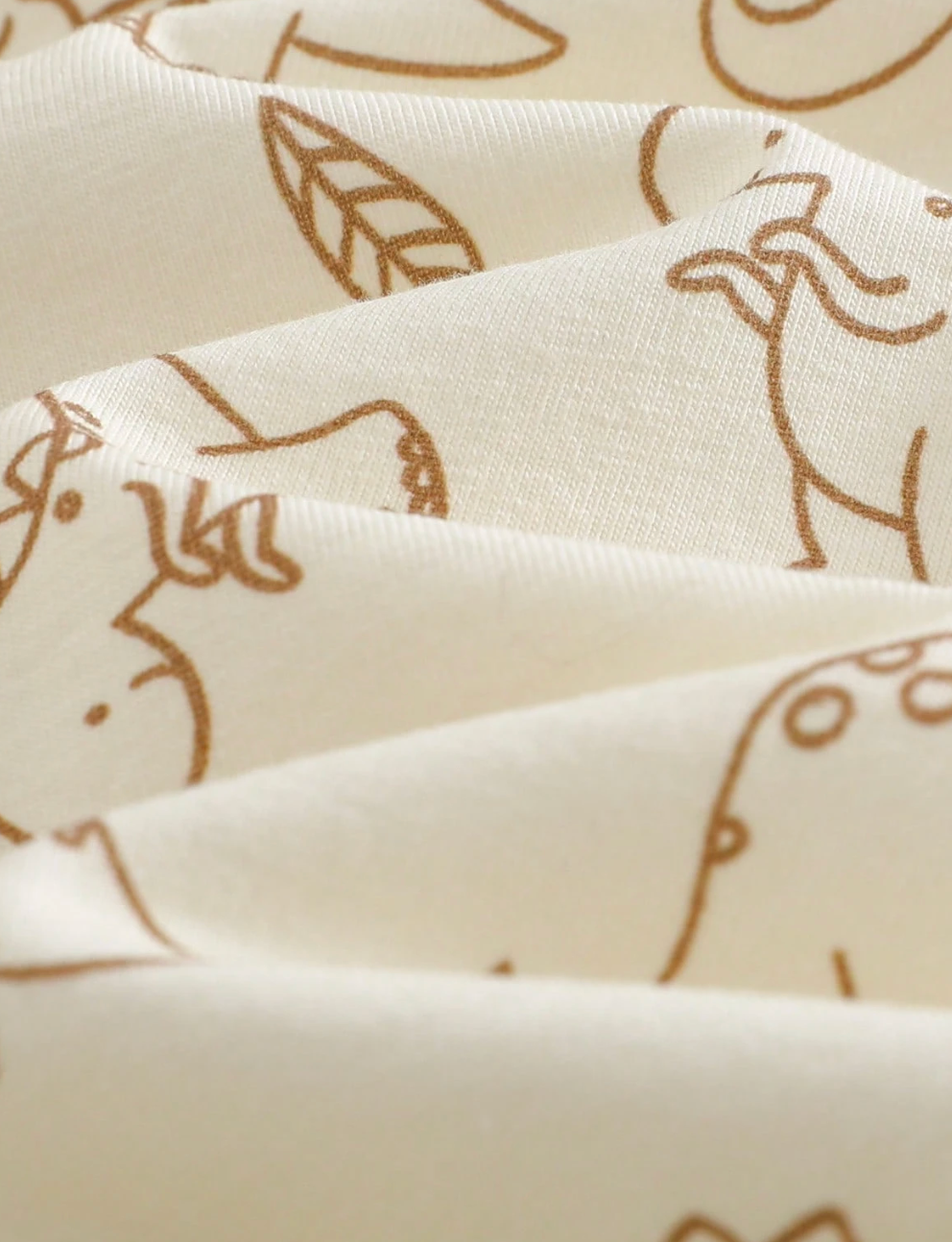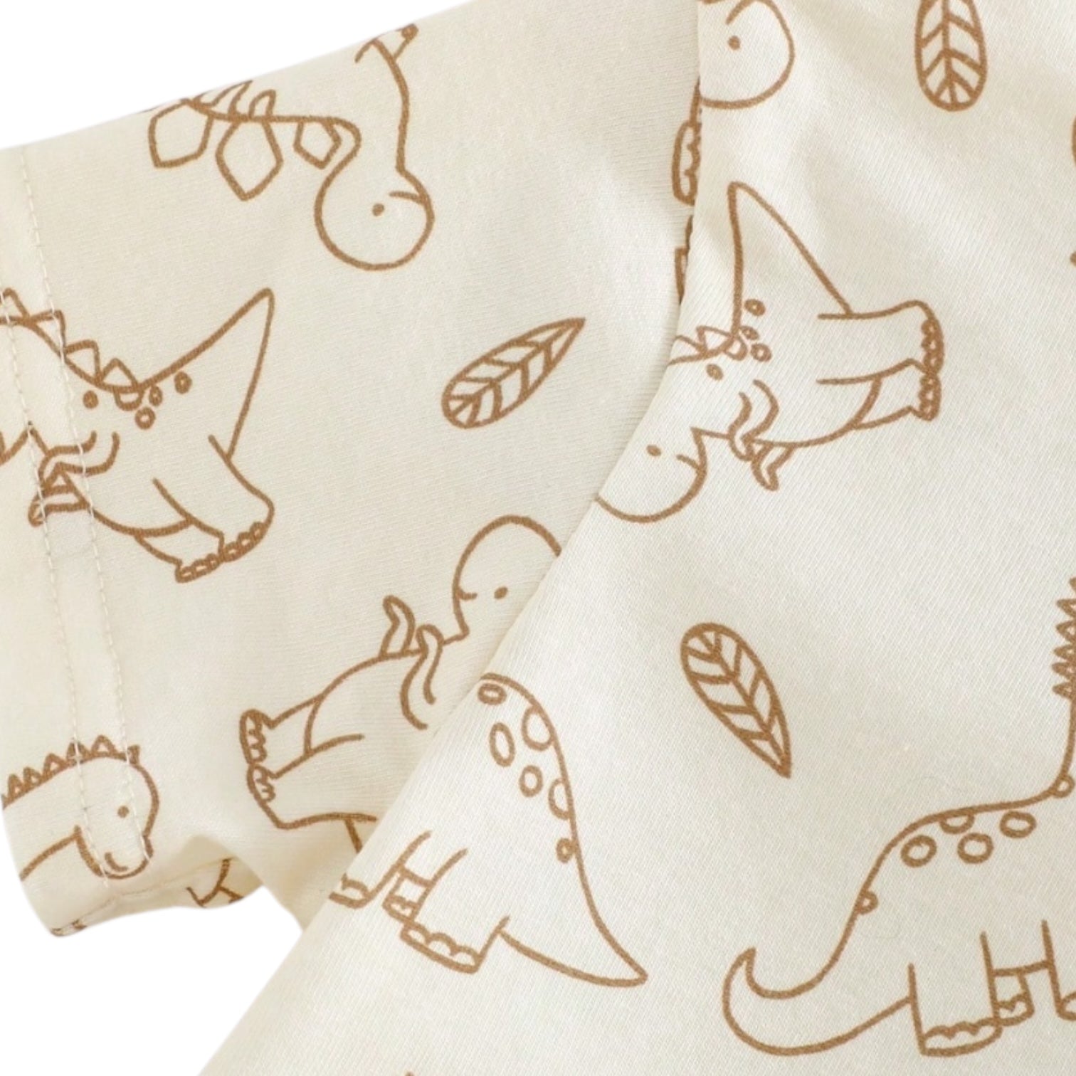 Estampado: Dibujos lineales de dinosaurios en tono marrón claro (Triceratops, Estegosaurio, Brontosaurio, T-Rex, etc.).