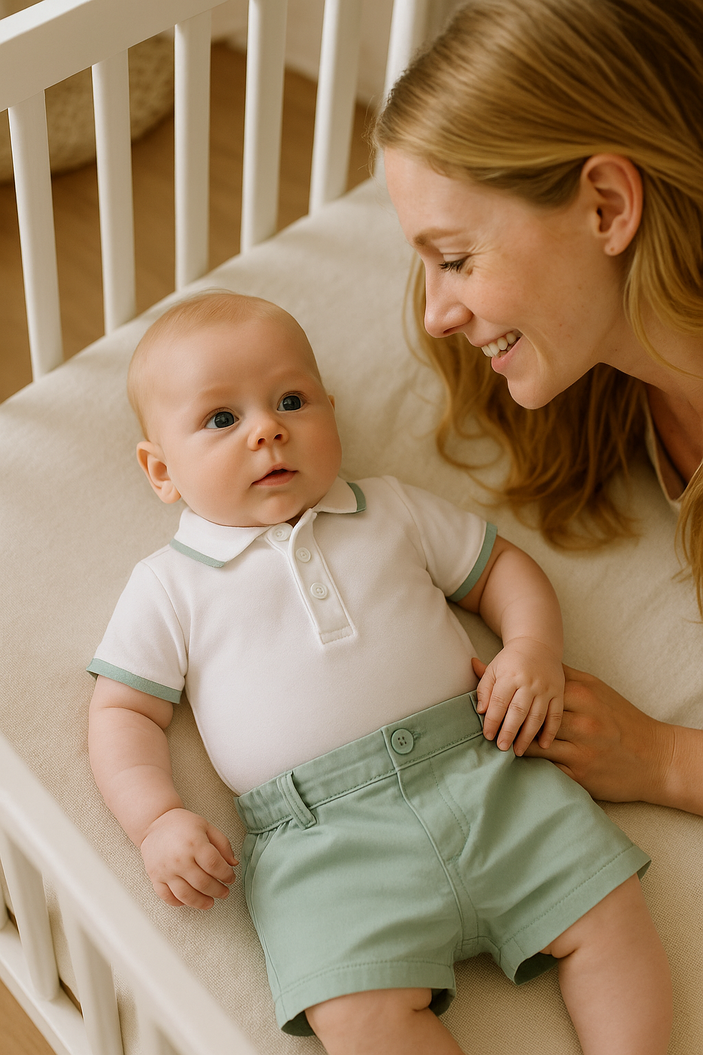 Un conjunto clásico, fresco y elegante que combina la practicidad del cuerpo tipo polo con la comodidad de un short en tono neutro. Ideal para bebés en cualquier ocasión, desde un paseo casual hasta un evento especial.