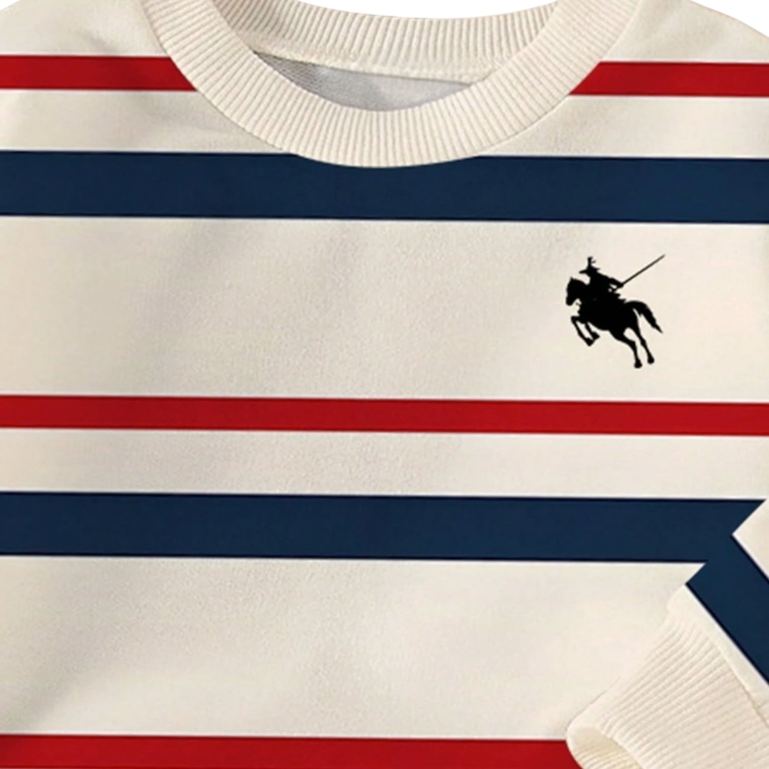 Detalle bordado: figura de jinete con caballo en color negro.