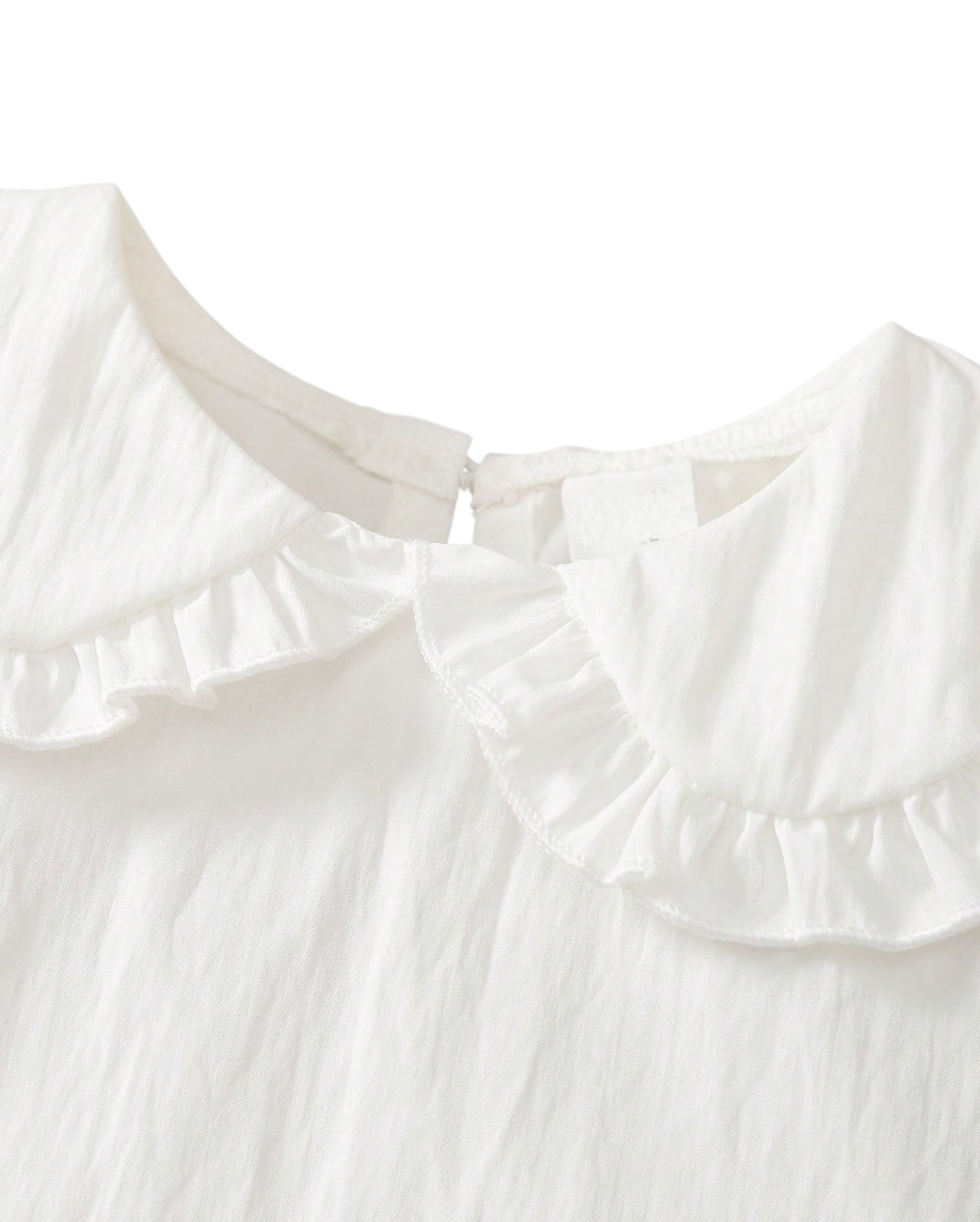 Conjunto para niña compuesto por blusa blanca con cuello decorativo y short con tirantes cruzados de estampado floral, ideal para primavera o verano.