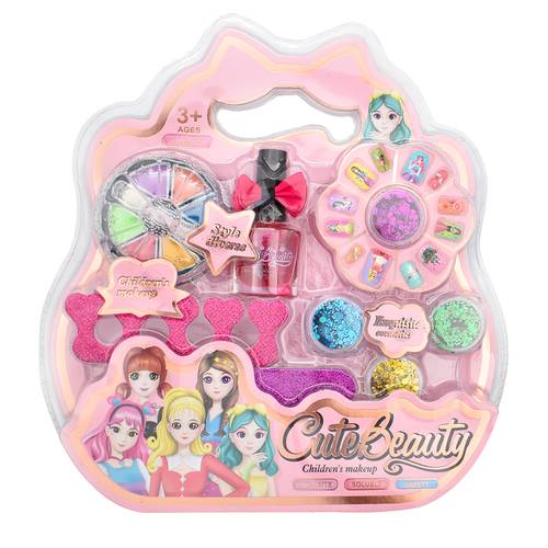 Set completo de belleza infantil: Incluye sombras de colores, esmalte, glitter, separadores para uñas, y decoraciones tipo joya.