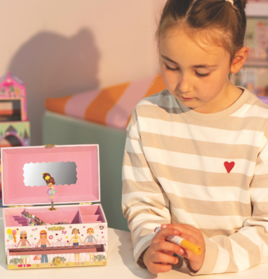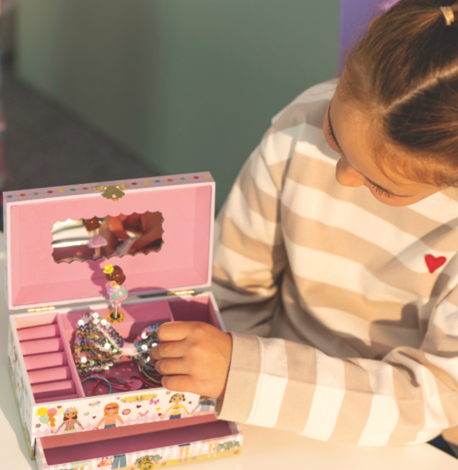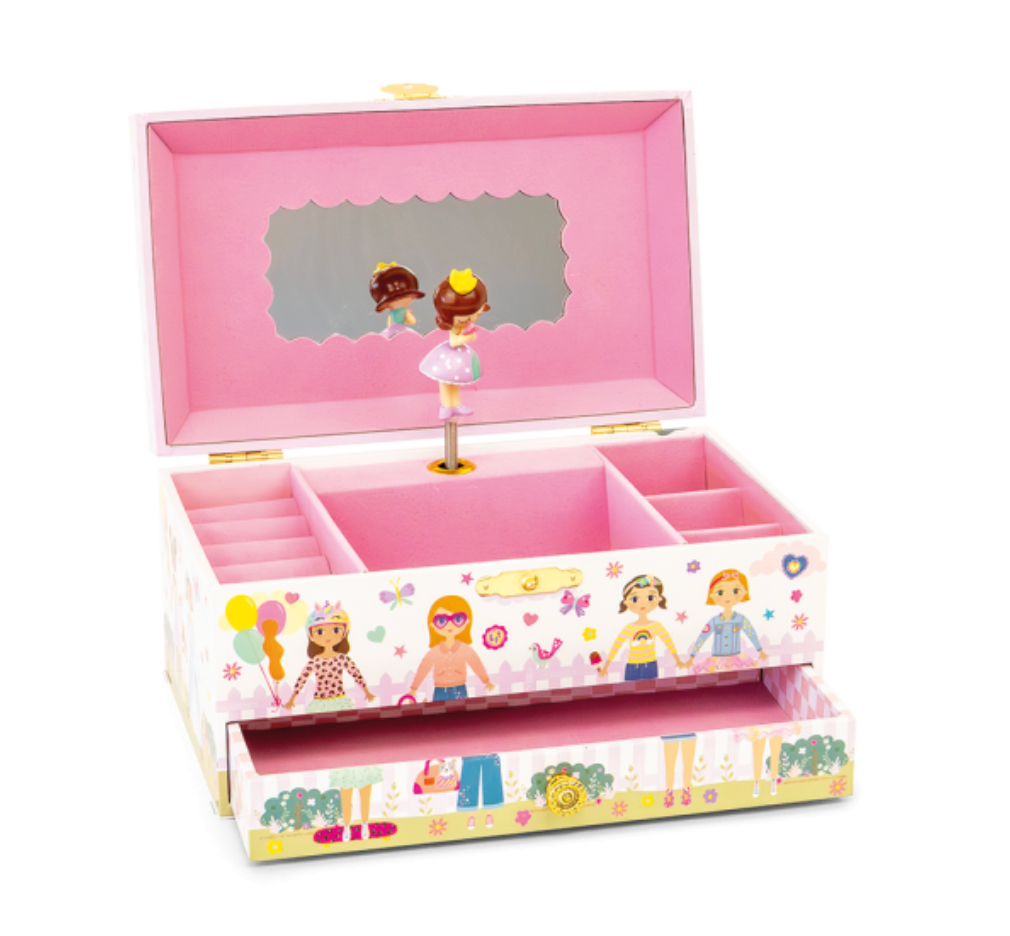Nuestro adorable Joyero Musical “Mejores Amigas” es el complemento perfecto para tus accesorios. Con su preciosa asa de perla, podrás mantener tus tesoros a salvo mientras juegas con tus amigas. Con preciosos detalles brillantes y nuestra adorable ilustración de mejores amigas, ¡qué más se puede pedir! Gira la cuerda trasera para escuchar “You’ve got a friend in me” mientras la princesa interior da vueltas.