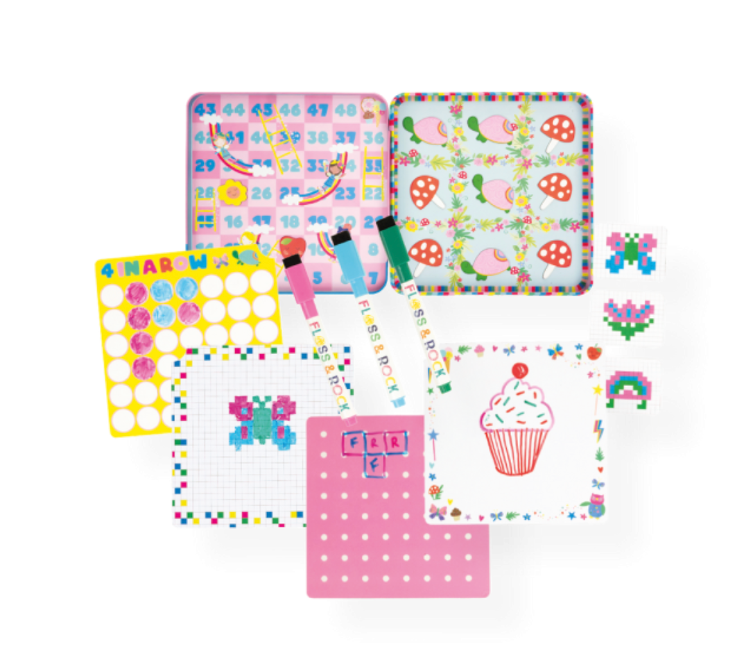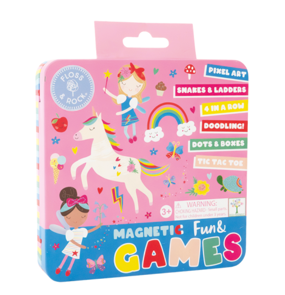 Nuestra nueva Caja Magnética de Diversión y Juegos está repleta de diversión para llevar. Descubre 6 actividades y juegos: “Serpientes y Escaleras”, “Tres en raya”, “Pixel Art”, “4 en Raya”, “Puntos y Cajas” y una página para dibujar. Cada caja es reutilizable e incluye piezas magnéticas extraíbles, 3 rotuladores de borrado en seco de colores con gomas de borrar y un dado para jugar. ¡Nuestro diseño de Hada Arcoíris es perfecto para los amantes de los unicornios, las hadas y el arcoíris!