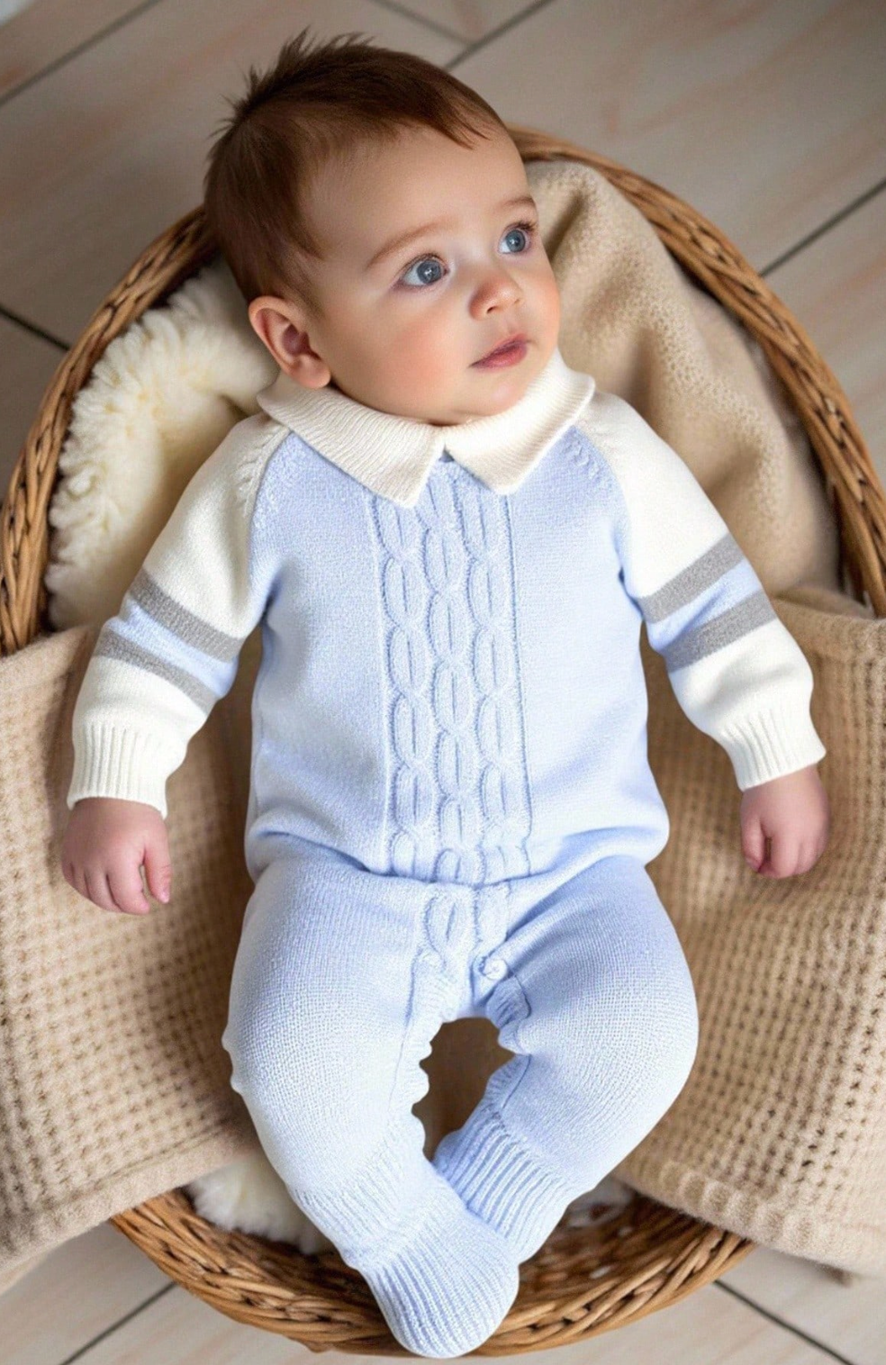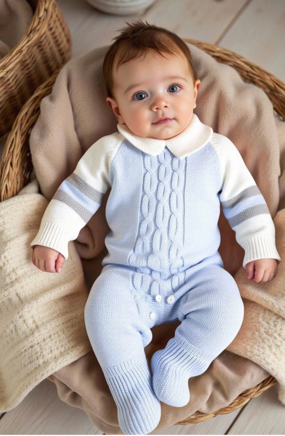 🎨 Color: Azul bebé con mangas en color crema y franjas decorativas gris y azul claro.