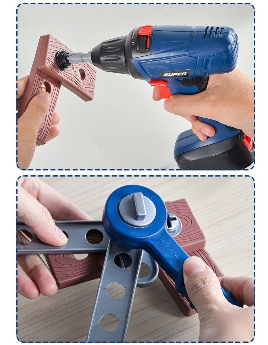 Set de herramientas de imitación: Incluye destornillador, llave, martillo, tornillos, engranajes, tuercas y piezas para ensamblar.