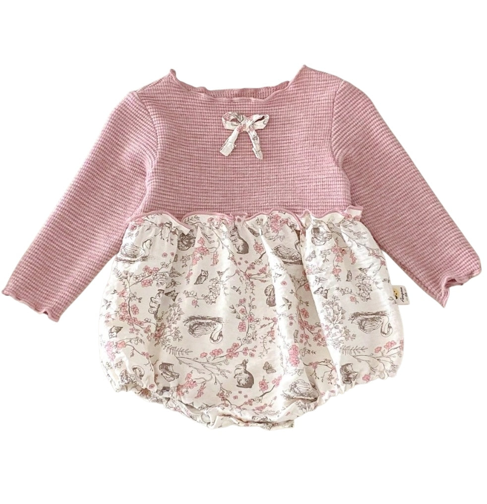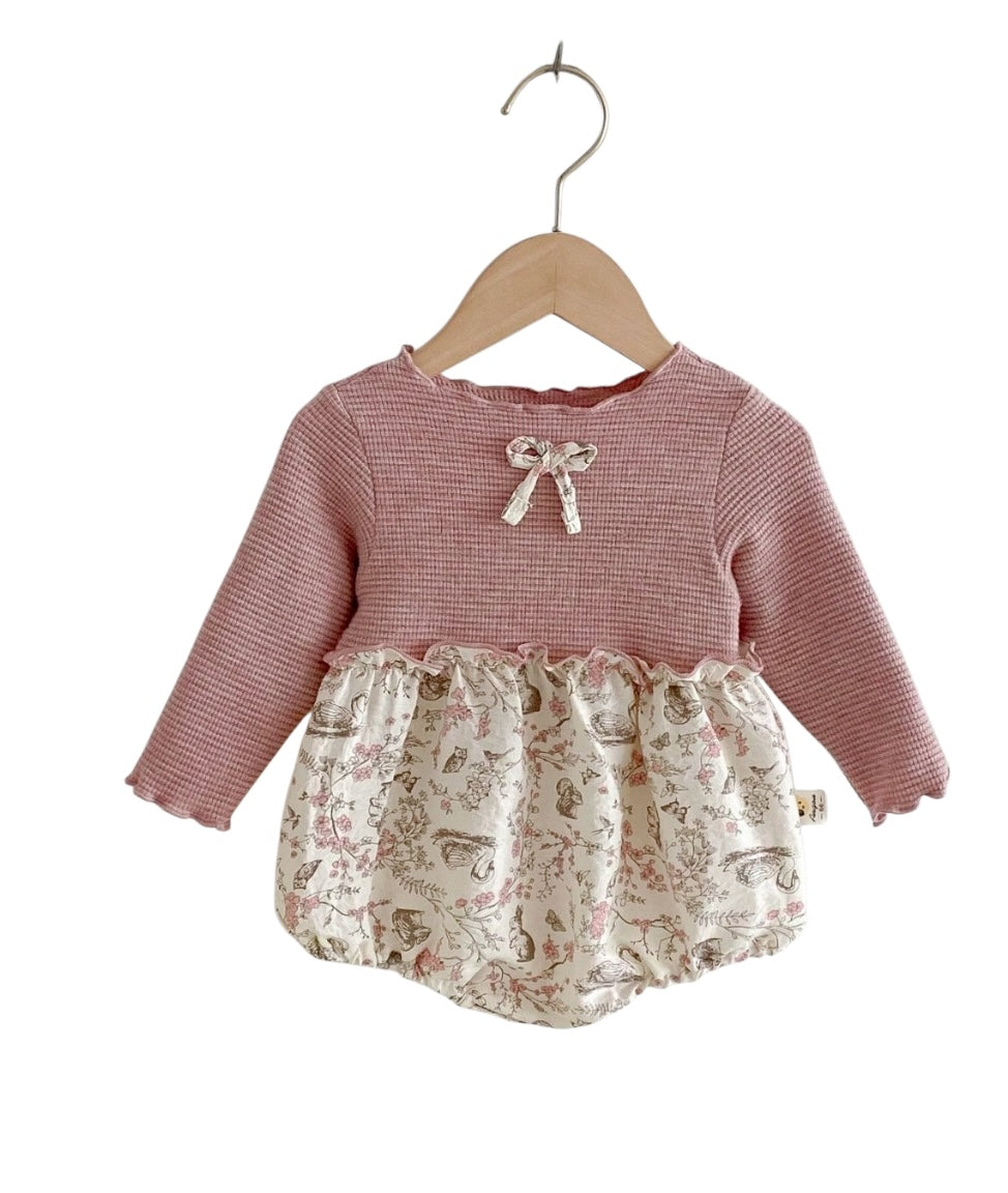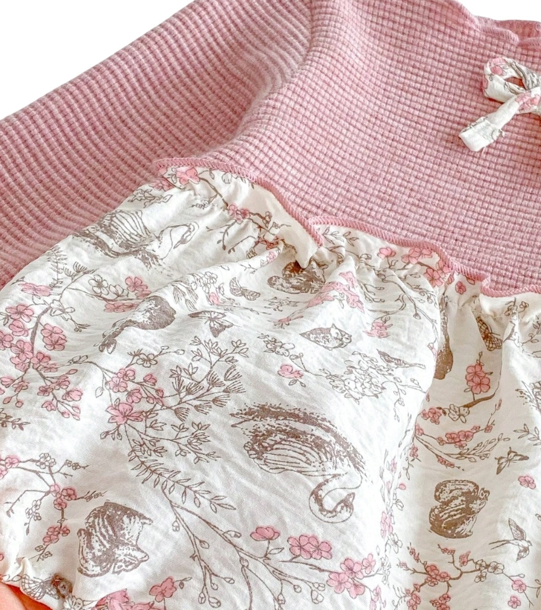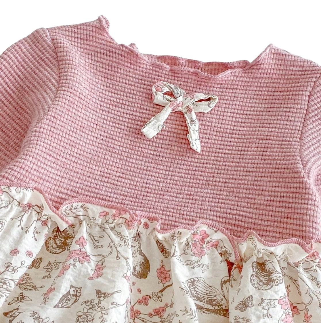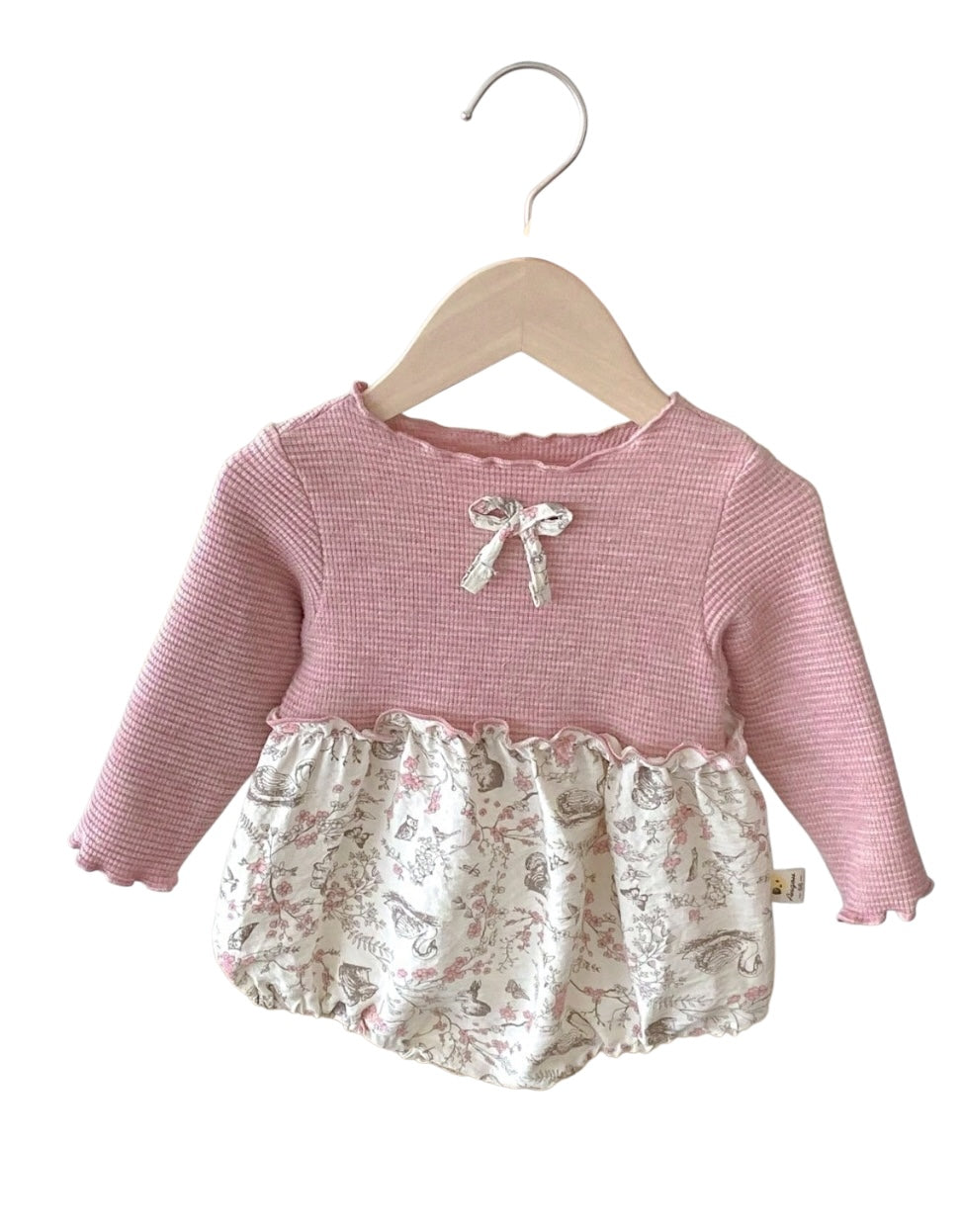 Diseño encantador y tierno: Parte superior en tejido waffle color rosa empolvado , con la parte inferior tipo bombacho de algodón estampado con conejitos y flores.