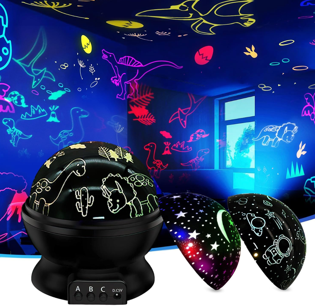 Con 3 patrones, el proyector de luz de dinosaurio permite a sus hijos explorar el emocionante mundo de los dinosaurios, el proyector de estrellas y luna lleva a los niños a un fantástico cielo estrellado y el proyector espacial inspira el interés de los niños por el universo. y el espíritu de exploración.